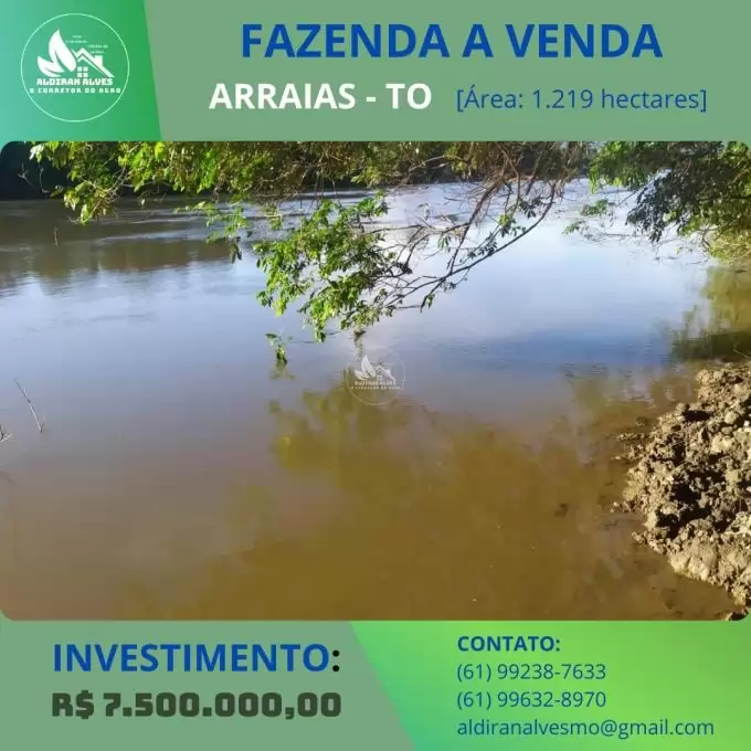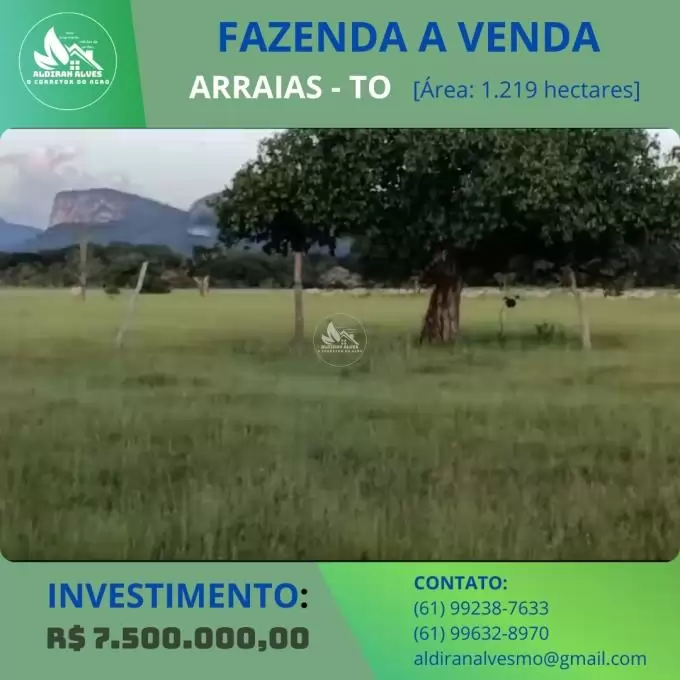 FAZENDANO MUNICIPIO DE ARRAIAS- TO SA0 250 ALQUEIRES 03 RIOS PERENES DENTRO DA PROPRIEDADE CASA FRACA CURRAL FRACO TIPO DE SOLO MISTO ( CULTURA, BARRO AMARELO E TERRA MAIS BRANCA) DISTANCIA DA CIDADE DE ARRAIS 95 KM SENDO 90 DE CHÃO. DISTANTE DA CIDADE DA PARANÃ 65 KM SENDO 50 DE CHÃO ( ESTRADA BOA) DOCUMENTAÇÃO (ESCRITURADA E REGISTRADA)